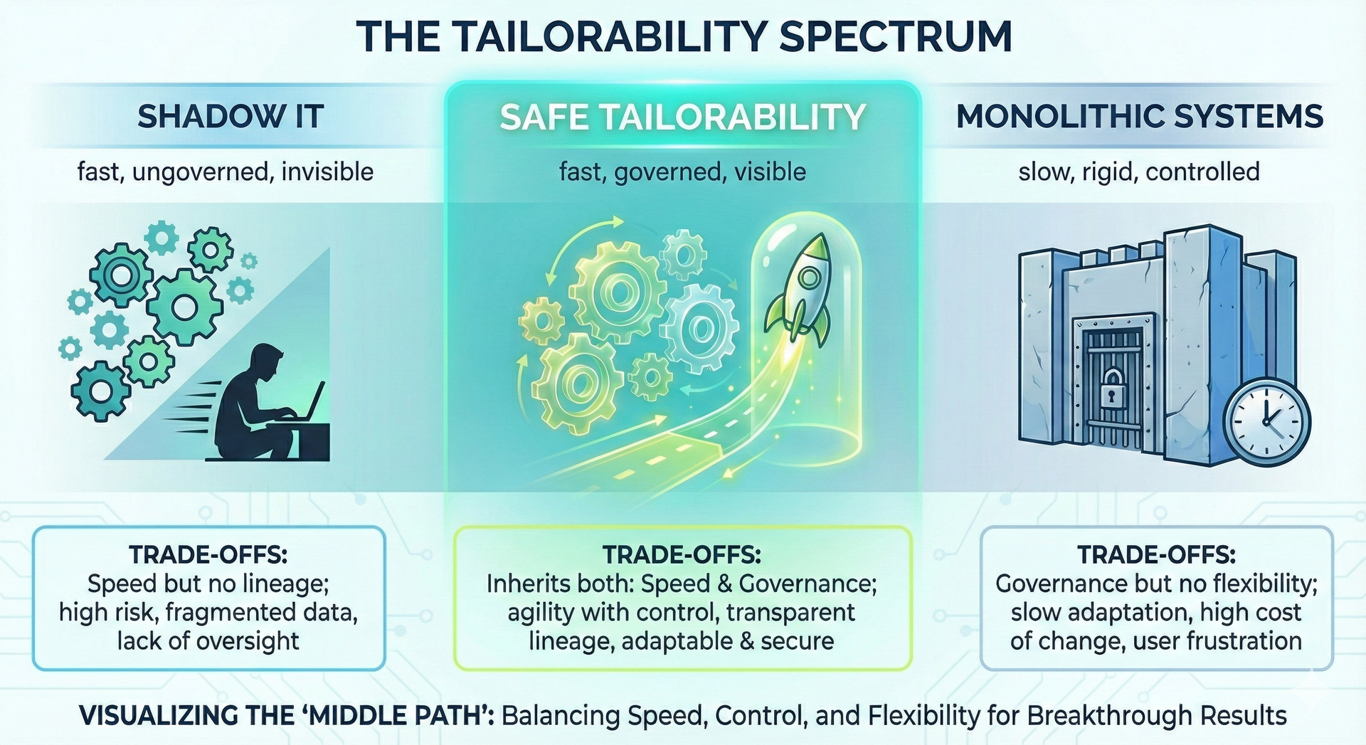 BLUF | Shadow IT is not a compliance problem. It is a design failure. The Intelligent Enterprise is where we need to go. Intelligent Transformation is how we get there. Solving tailorability at the tactical level is what we build along the way.