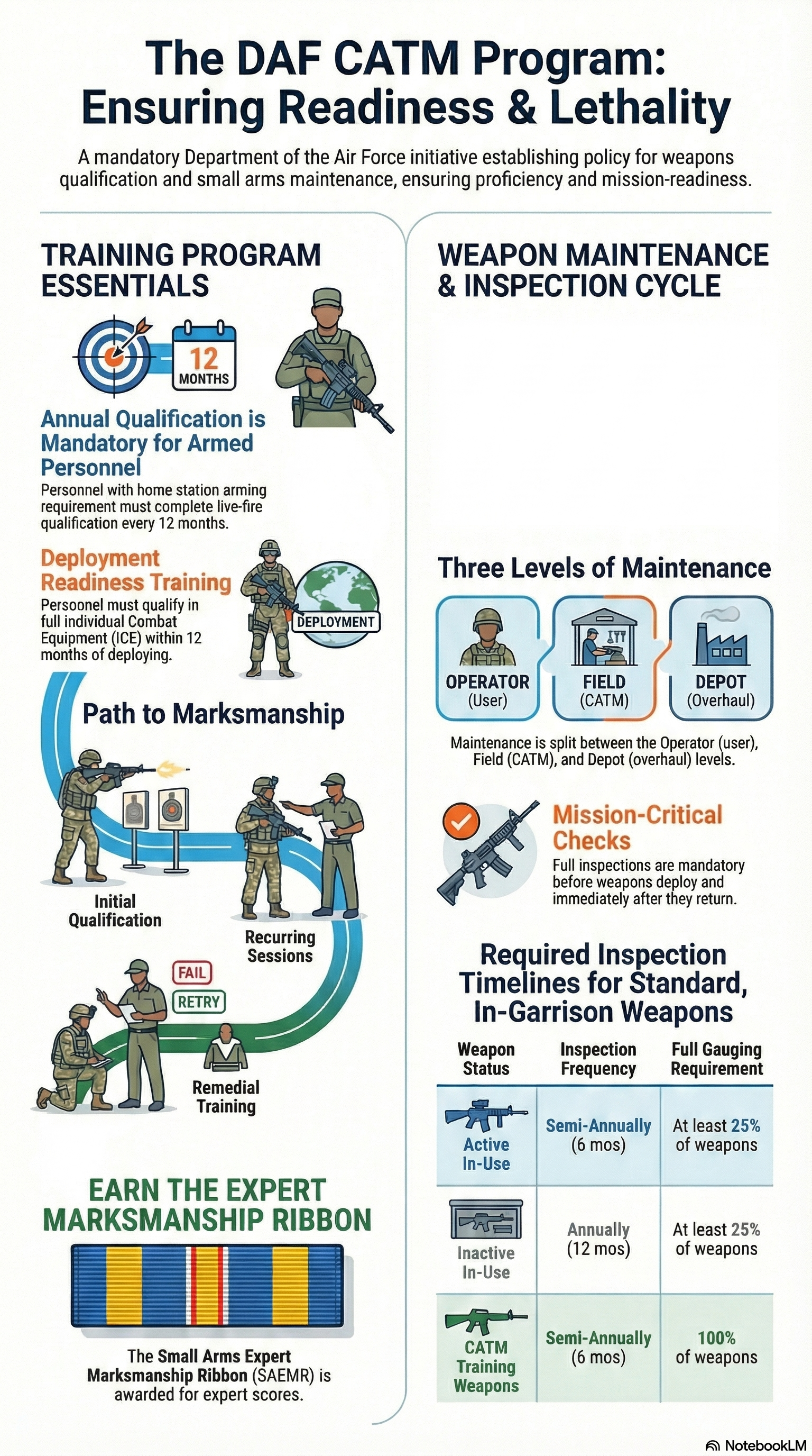 Infographic of Combat Arms Training and Maintenance (CATM) Department of the Air Force (DAF) 31-131 DAFI/DAFMAN using notebookLM