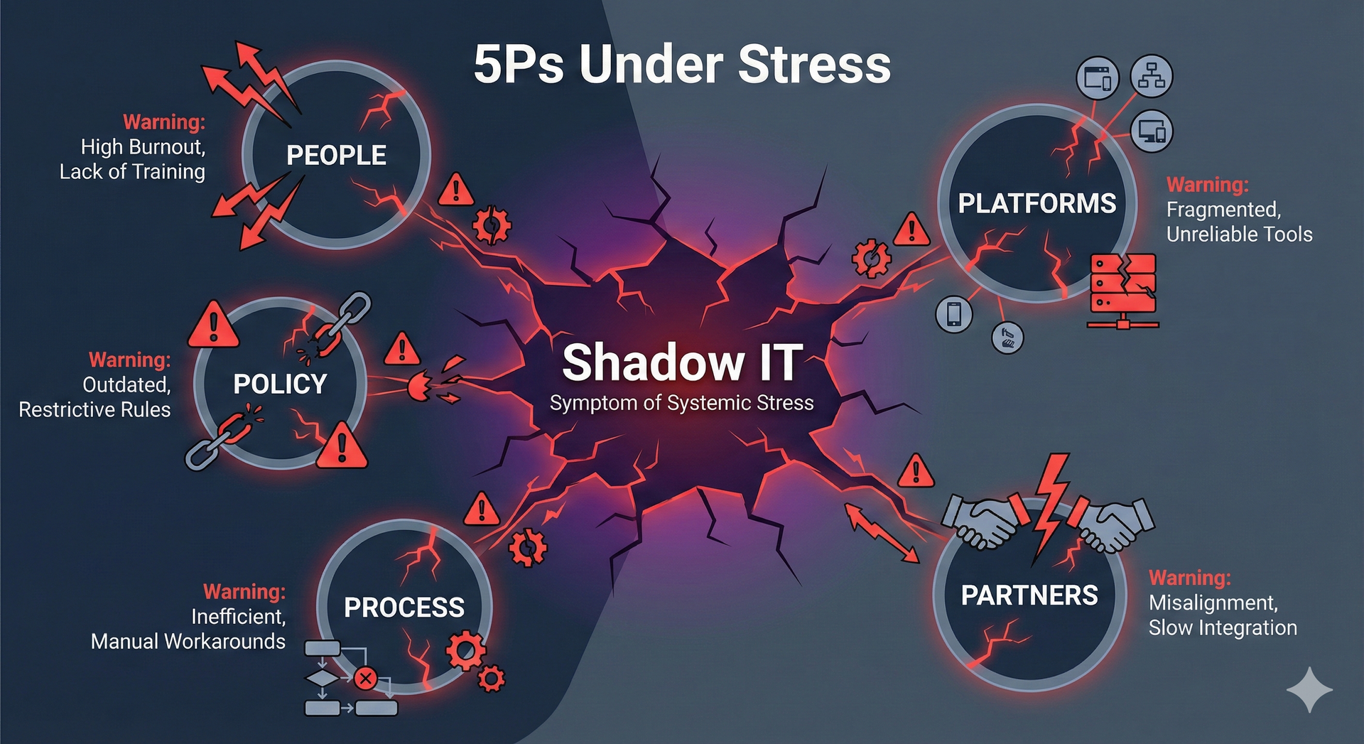 I have written before about the 5Ps of Intelligent Transformation: People, Policy, Process, Partners, and Platforms. Shadow IT sends signals across all five. People improvise because platforms cannot flex. Processes fracture because policy cannot adapt. When you see Shadow IT, you are seeing the 5Ps under stress.