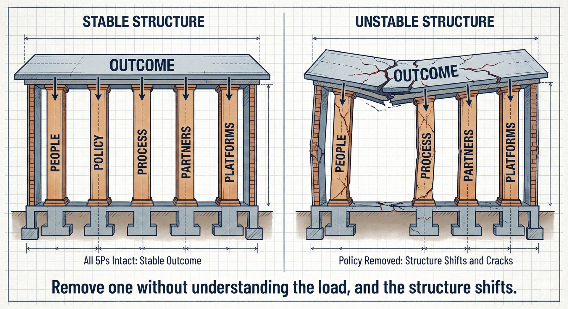 All three definitions share a common thread, and it has nothing to do with headcount. Efficiency is about process. It is about how people, policies, processes, partners, and platforms work together to produce an outcome. These five elements, the 5Ps, exist in every organization and every contract. When they are aligned, workflows and value compounds. When one is removed without understanding how it connects to the others, the system does not simply shrink. It fractures in ways that are difficult to predict and expensive to repair.