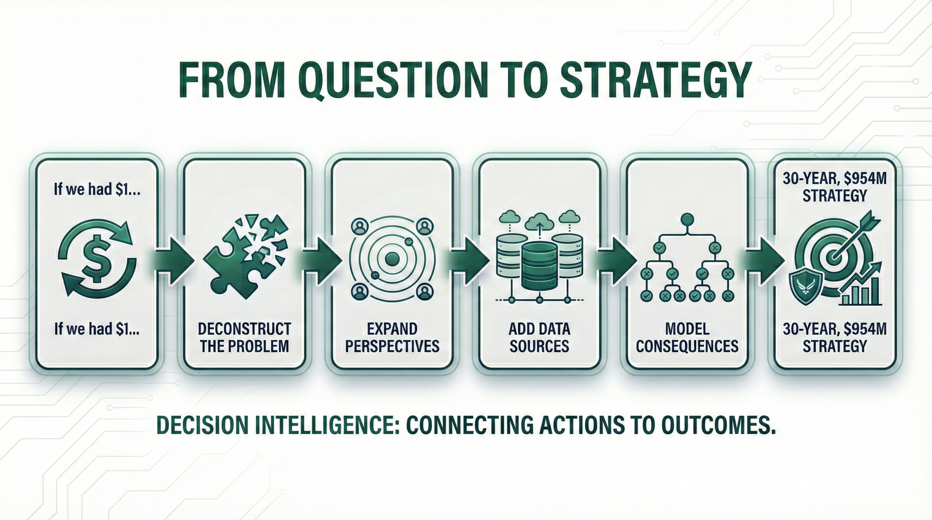 By May 2018, we delivered a 30-year, $954 million strategy for right-sizing every firing range across the globe. It was the first asset management approach of its kind in the Air Force. I did not call it Decision Intelligence at the time, but that is exactly what it was: connecting actions to outcomes, modeling consequences, and putting leaders in a position to make informed choices before committing resources.