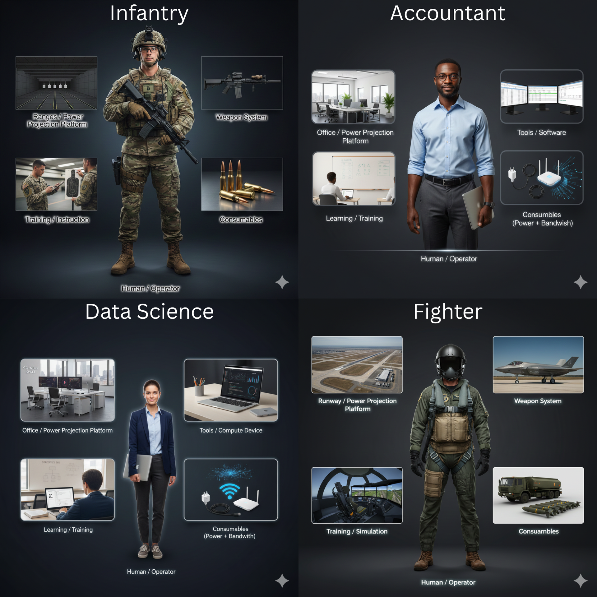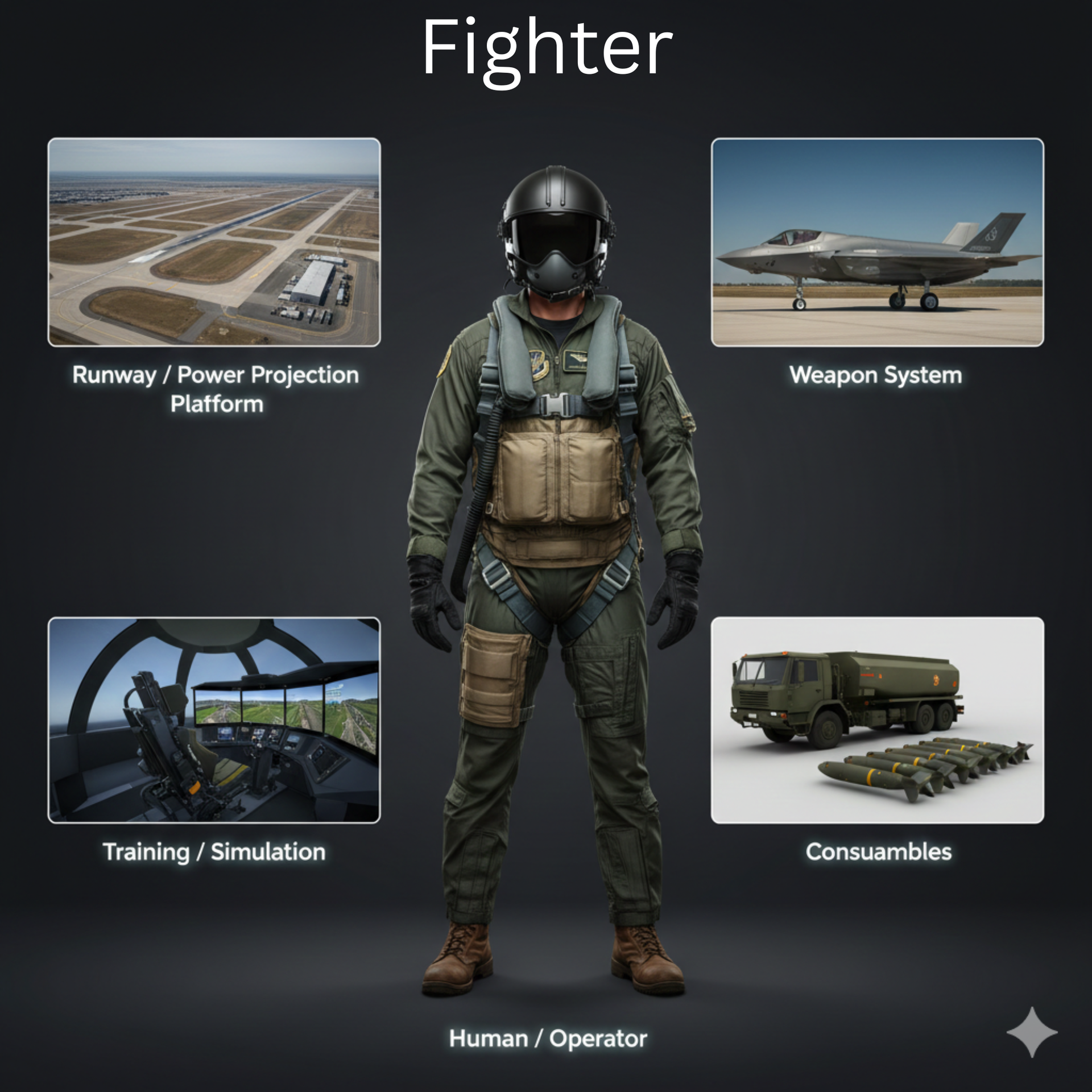 Think about an F-16 and F-35. They are not just two aircraft. They represent two points on a capability axis. Each requires different pilots, different maintenance, different doctrine, and different logistics. The aircraft alone delivers nothing. Capability emerges when the system combines with trained operators and support.