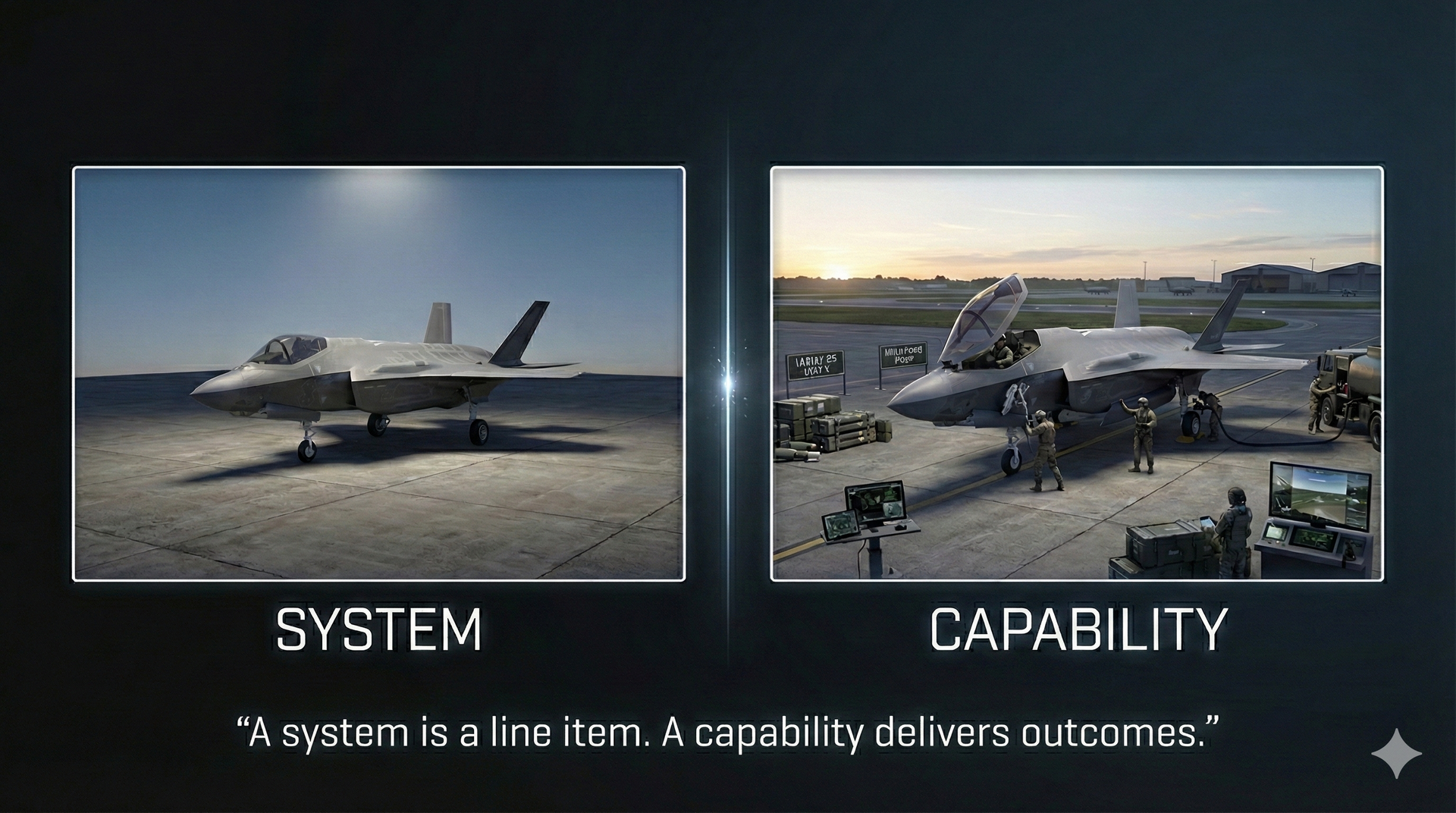 Programs fail not because systems break. They fail because no one asked whether the system could actually deliver an outcome. A fighter jet without pilots, maintenance crews, fuel logistics, and training pipelines is not a capability. It is an expensive artifact.