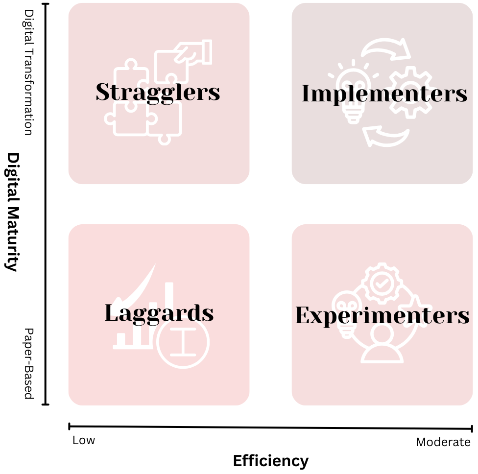 - Stragglers: These organizations have adopted some digital tools but are not using them effectively, leading to limited efficiency gains. This could be due to a lack of training, poor implementation, or resistance to change. To overcome these challenges, they should focus on optimizing processes and enhancing their digital capabilities.