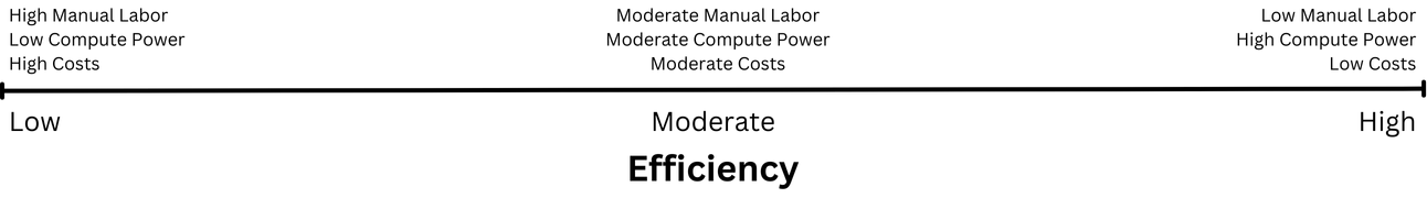 - Efficiency (X-Axis): This axis measures how effectively an organization utilizes its resources (time, money, labor, etc.) to achieve its goals. It ranges from low efficiency, characterized by high manual labor, low compute power, and high costs, to high efficiency, marked by minimal manual labor, extensive compute power, and lower costs.