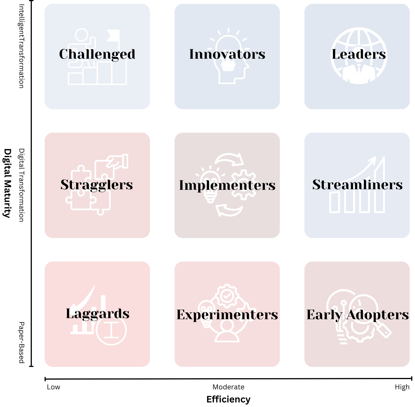 Quality declined. Trust eroded. Teams often fall into what I call the accountability gap, where automation runs ahead of professional judgment. On the Digital Efficiency Matrix, they tend to land in the Challenged quadrant, high digital maturity but low efficiency. Everything is digitized, but much of the work remains manual.